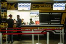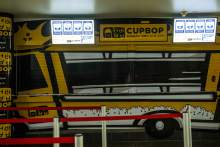 The Cupbop stand is bright yellow and pays homage to where the Korean barbecue noodle bowls were first sold in Utah.