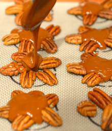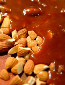 Clamp a candy thermometer to the side of the saucepan. Do not stir the mixture as it cooks, but watch the candy thermometer carefully. Once the temperature of the caramel reaches 300 degrees, hard crack stage, remove the pan from the heat. Pour the hot caramel evenly over the almonds on the prepared pan.