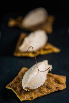 One of my new favorites is a beautifully composed pinxto of trout mousse on a house-made lavosh cracker ($2 each). The mousse was just the right amount of creamy, tasting fully of trout without being fishy, and a perfect counterpoint to the flaky cracker. The crowning glory was ruby threads that had a slight bite, like spun pepper.