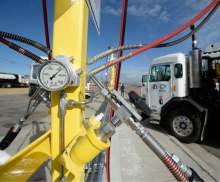 Sanitation truck fills up at Salt Lake County Fleet Management's new CNG (compressed natural gas) filling station Tuesday Nov. 3. The new CNG filling stations will service its large fleet of trucks that are switiching from diesel to the cleaner, cheaper charged natural gas. The change to this fuel is expected to reduce the fleet's contribution to air pollution in the Salt Lake Valley -- just as residents brace for on the onset of inversion season.