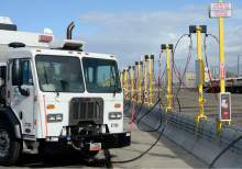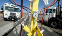 Sanitation trucks fill up at Salt Lake County Fleet Management's new CNG (compressed natural