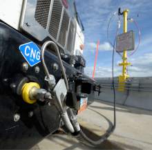 Sanitation truck fills up at Salt Lake County Fleet Management's new CNG (compressed natural
