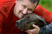 Alex Gallivan with "Coco" a pit bull he is dog-sitting for neighbors, Saturday, October 24, 2015. Alex's own dog, "Chumley" recently passed away.