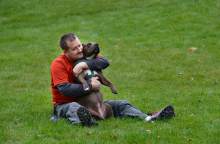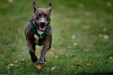 "Coco" - a pit bull Alex Gallivan is dog-sitting for neighbors, runs to him Saturday, October 24, 2015, in Liberty Park. Alex's own dog, "Chumley" recently passed away.