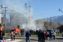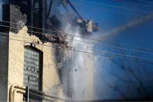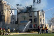 Firefighters water cannons break through the brick walls in order to have the water reach the fire inside the iconic Silver Cup fish feed factory in Murray, Saturday, November 7, 2015.
