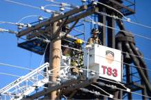 Firefighters look from one of the cranes that surrounded the two-alarm fire at the ico