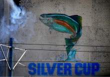 The iconic fish symbol on the west side of the Silver Cup fish feed factory in Murray
