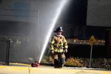 Murray place block the street to traffic as firefighters battle a two-alarm fire at th