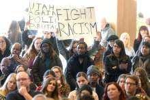 Students filled the auditorium at Olpin Union building at the University of Utah Friday Nov. 20 for an open discussion on the school's attempts at inclusivness and fairness to it's minority students.  A handful of minority students in the crowd held a silent protest during the discussion with signs and taped mouths saying the university doesn't do enough to represent them.  The protestors were welcome but most students used the time to listen and vocalize their problems with the school's lack of support programs for minority students and what it could do better.