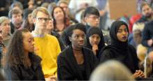 Students fill the auditorium at Olpin Union building at the University of Utah Friday Nov. 20 for an open discussion on the school's attempts at inclusivness and fairness to it's minority students.  A handful of minority students in the crowd held a silent protest during the discussion with signs and taped mouths saying the university doesn't do enough to represent them.  They were welcome but most students used the time to vocalize their problems with the school's lack of support for minority students and what it could do better.