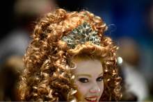 An Irish dancer displays one of the large, curly wigs that are common in the sport as Utah hosted the Western Regional Championships of Irish Dance (The Western Regional Oireachtas) at the Salt Palace Convention Center, Sunday, November 22, 2015.