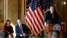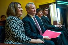Utah Supreme Court Justice nominee John Pearce, his wife Jennifer Napier-Pearce and sons Jonas, 14, and Ben, 17, listen while he is confirmed by the Senate at the Utah State Capitol Wednesday December 16, 2015.