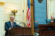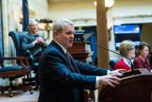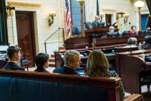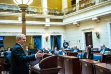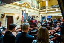 Utah Supreme Court Justice nominee John Pearce, his wife Jennifer Napier-Pearce and sons Jonas, 14, and Ben, 17, listen while he is confirmed by the Senate at the Utah State Capitol on Wednesday.