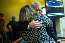 Utah Supreme Court Justice nominee John Pearce hugs his wife Jennifer Napier-Pearce after being confirmed by the Senate at the Utah State Capitol Wednesday December 16, 2015.