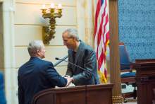 Senate President Wayne L. Niederhauser shakes the hand of Utah Supreme Court Justice nomin