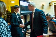 Utah Supreme Court Justice nominee John Pearce shakes the hand of his son Jonas, 14, after being confirmed by the Senate at the Utah State Capitol Wednesday December 16, 2015.