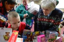 Homeless advocate Pamela Atkinson joins Guy Panek, 6, in picking out a Christmas presen