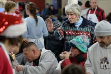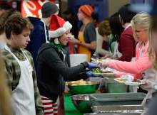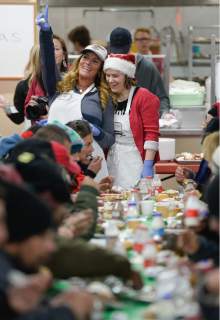 Buffy Parker, center left, gets another plate to serve as multiple volunteers and community leaders serve the annual Christmas dinner to more than 800 homeless Utahns Friday at St. Vincent de Paul Dining Hall in downtown Salt Lake City.