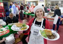 Claudia Pohl of Hamburg, Germany who was in town visiting friends, lends a helping hand for the annual Christmas dinner to more than 800 homeless Utahns Friday at St. Vincent de Paul Dining Hall in downtown Salt Lake City.