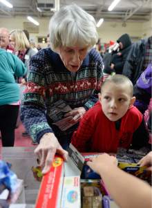 Homeless advocate Pamela Atkinson joins Guy Panek, 6, in picking out a Christmas present during the annual Christmas dinner to more than 800 homeless Utahns Friday at St. Vincent de Paul Dining Hall in downtown Salt Lake City.