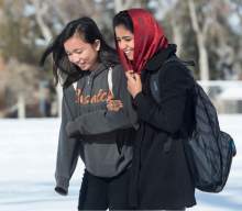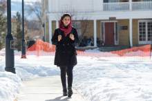 On campus, Sonita giggles girlishly with a friend one minute, and the next, she's quietly checking in with the photographer who has stumbled while scrambling ahead on a snowy campus path to capture a shot.