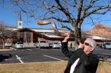 Father and son Brand and Nickaoli Thornton, of Dillon, Mont., blew into shofars to sound not a somber note, but one they said would call upon God to protect them in a coming battle.