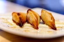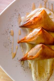 While most of the meze are savory, we were delighted with the slightly sweet kolokithopita ($9), which surprised us as we broke through the honey-drizzled crispy phyllo triangles to find a creamy mixture of warm butternut squash and goat cheese.
