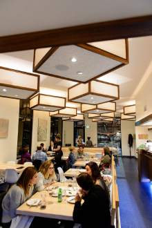 Diners can sit at the kitchen counter and watch the chefs prepare pan-seared branzino (psari psito, market price) on the line or enjoy more traditional restaurant seating that affords a view of the open kitchen or surrounding neighborhood.