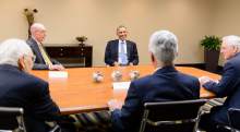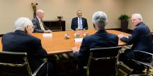 President Barack Obama meets with leaders of the Church of Jesus Christ of Latter-day Saints at the Sheraton Hotel during visit to Utah, Thursday April 2, 2015. Left to right are Tom Perry, Henry Eyring, President Obama, Dieter Uchtdorf, and Todd Christofferson