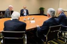 President Barack Obama meets with leaders of The Church of Jesus Christ of Latter-day Saints at the Sheraton Hotel during visit to Utah, Thursday April 2, 2015. Left to right are L. Tom Perry, Dieter F. Uchtdorf, Henry B. Eyring, D. Todd Christofferson, and President Obama.