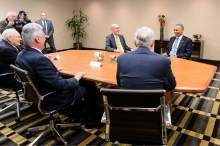 President Barack Obama meets with leaders of the Church of Jesus Christ of Latter-day Saints at the Sheraton Hotel during visit to Utah, Thursday April 2, 2015. Left to right are Henry Eyring, Tom Perry, President Obama, Dieter Uchtdorf, and Todd Christofferson
