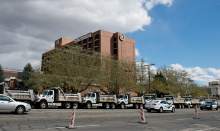 A barricade of garbage trucks lines the street in tfront of the Sheraton hotel on 200 West in Salt Lake City, Thursday, April 2, 2015. President Barack Obama is expected to stay at the hotel before speaking at Hill Air Force Base on Friday.