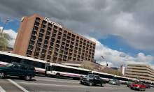 A barricade of garbage trucks lines the street in tfront of the Sheraton hotel on 200 Wes