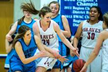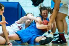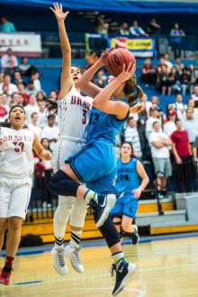 Skyhawks sophomore post Lauren Gustin got into foul trouble early against Redding, who finished with 20 points and nine rebounds.