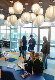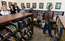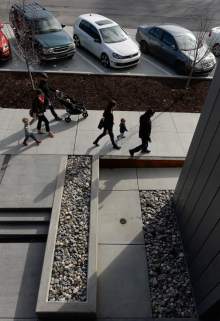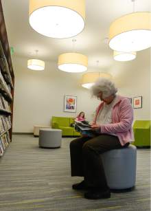People visiting the large patio on the second floor are reflected in the book stacks as Salt Lake City Public Library's newest library, the Marmalade Branch, has its grand opening on Saturday. The Marmalade Branch, at 280 West 500 North in Salt Lake City, is The City Library's eighth location. The two-story facility offers more than 18,000 square feet of space for the growing Marmalade and West Capitol Hill neighborhoods.