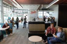 People visiting the large patio on the second floor are reflected in the book stacks as