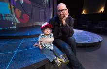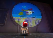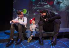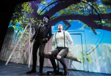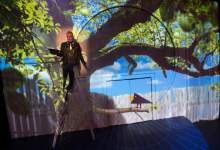Sometimes the actors merge with the animations and video sequences. My favorite scene features Blue and Thunder Tiger sitting together in a giant opening in the center of the screen to watch the stars, surrounded by images of leaves and branches. Director Alexandra Harbold fluidly integrates live action and animation and keeps everything moving.