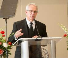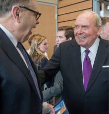 Russell Ballard, a member of the Quorum of the Twelve Apostles in The Church of Jesus Christ of Latter-day Saints, led a prayer thanking Huntsman and asking Heavenly Father to watch over the octogenarian philanthropist, before praising the university as a place for students to "learn, meet and find companions."
