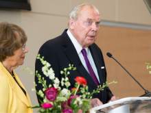 Billionaire industrialist and philanthropist Jon Huntsman Sr., told about 200 faculty, lawmakers, business leaders and others that honesty and integrity would be the most important lessons for students who come through the sleek glass building.