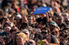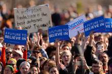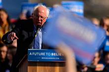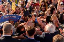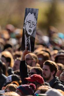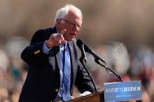He clutched a wooden podium and freely deployed his trademark elaborate hand gestures as the wind whipped his white hair skyward. And with a crowd chanting "Bernie," Sanders delivered his progressive hits. He expressed his support for a $15 minimum wage, eliminating tuition for public colleges and universities, lowering student-loan interest rates, expanding Social Security benefits and providing a Medicare-like health system for all.