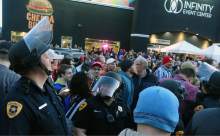 Trump spent 45 minutes with a tightly packed, rowdy crowd of about 500 at the Infinity Event Center in downtown Salt Lake City. He said he saw a big protest on the streets as his car drove from the airport, calling some of them agitators. No protesters disrupted Trump's speech, but a group outside the building blocked attendees from leaving for 15 minutes.