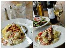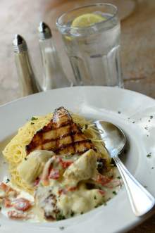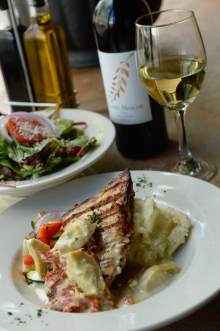 Caffé Molise owner and chef Fred Moesinger recalls the pollo alla gratella dish as an example. The tender, grilled chicken breast is marinated in garlic oil and balsamic vinegar and comes with a tangy sauce of artichoke hearts, sun-dried tomatoes and gorgonzola cheese for both meals. But "at lunch it's served with aglio e olio [a roasted garlic pasta side]. At dinner, it's served with a dinner salad, garlic mashed potatoes and seasonal vegetable sides." Portions of the chicken breast are also smaller at lunch, with a 5-6-ounce breast piece versus the dinner 8-ounce size, and these changes are reflected in the prices: $12.95 for lunch and $19.95 at dinner.