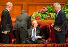 The First Presidency's three members, including LDS Church President Thomas S. Monson, attended Saturday's women's session ,as did three Mormon apostles Jeffrey R. Holland, D. Todd Christofferson and Ronald A. Rasband the presiding bishop, Gérald Caussé, and board members of the three women's and children's organizations.