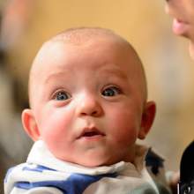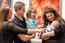 Haiden Morgan turned 7 months old Friday, lounging in his father's arms and staring with wide blue eyes at the news cameramen circling his family in a University Hospital conference room.