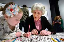 The revered Utah advocate for the homeless, Pamela Atkinson, worked with one young girl as she colored in images. She said Utah has done well integrating refugees, as many as 30,000 since the 1970s when Vietnamese began arriving.