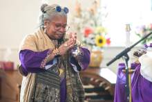 Rev. Nurjhan Govan claps her hands during a pastor appreciation service at Trinity African