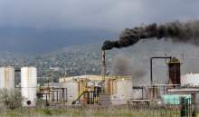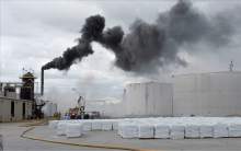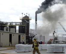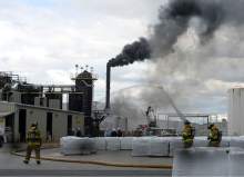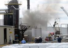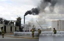 Firefighters battle a smoky fire from an asphalt container at an industrial refinery at 2600