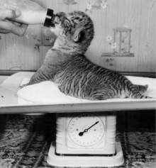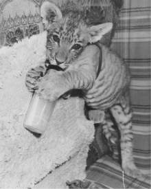Shasta weighed 1 pound 12 ounces at birth. Her mother rejected her, so newspapers said city parks director Joseph L. Sloan took the kitten home to bottle-feed her.