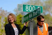 Mayor Jackie Biskupski and sign shop supervisor James Aguilar hang the first of the Harvey Milk Blvd. street signs along 900 South in Salt Lake City, Friday May 13, 2016. The Salt Lake City Streets Division will hang signs throughout the day between 800 East and 1100 East in preparation for the Harvey Milk Celebration on Saturday, May 14th. Signage along the remaining designated portions of 900 South will be completed in the next few weeks.