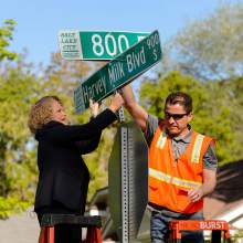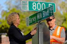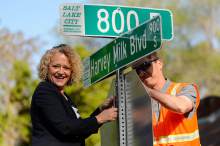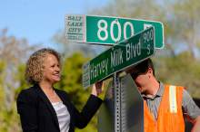 Mayor Jackie Biskupski and sign shop supervisor James Aguilar hang the first of the Harvey Milk Blvd. street signs along 900 South in Salt Lake City on Friday. The Salt Lake City Streets Division will hang signs throughout the day between 800 East and 1100 East in preparation for the Harvey Milk Celebration on Saturday, May 14th. Signage along the remaining designated portions of 900 South will be completed in the next few weeks.